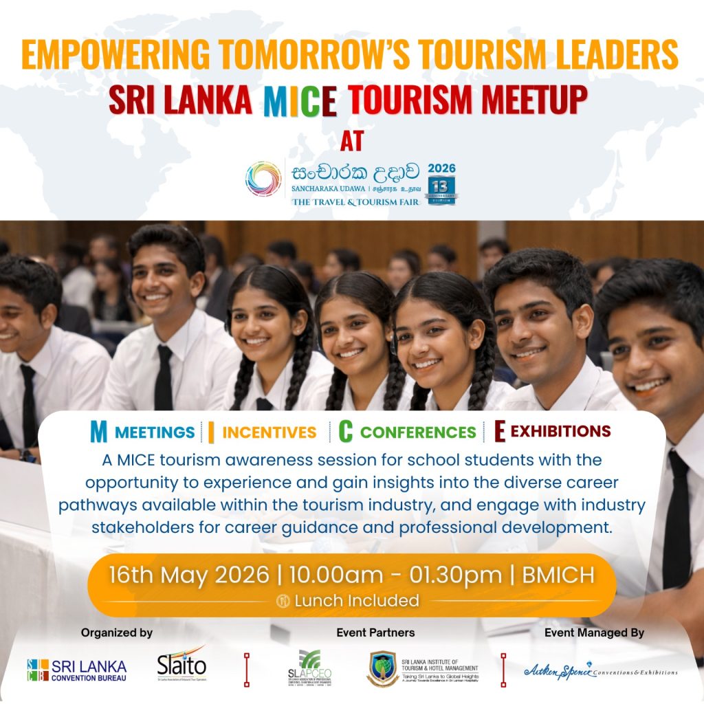 Join us on 16th May 2026 for the Sri Lanka MICE Tourism Meetup/Career Guidance Workshop, designed to inspire and educate school students about the exciting world of Meetings, Incentives, Conferences, and Exhibitions (MICE) tourism.